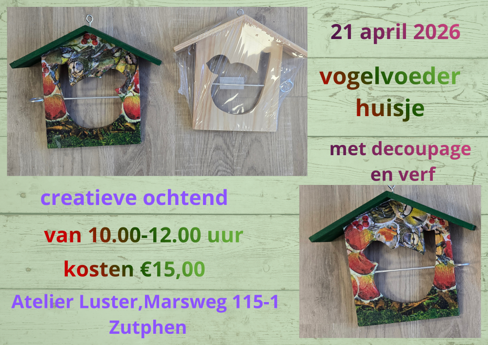 Op een houten appel/voedervogelhuisje (plat) gaan we aan de slag met verf en decoupage papiertjes.